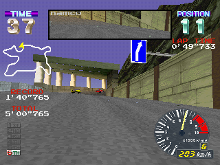 アーケードのシリーズ2作目 「リッジレーサー2」 をアレンジ移植。前作には無かったバックミラーの追加と、PS2台をケーブルで接続した通信対戦に対応。アーケード版の 「2」 は、あくまで前作に通信対戦機能を付加したマイナーチェンジ版だったのに対し、このPS版はコースも全て変更されています。